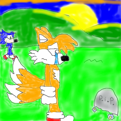I would say his mom is dead, because well you don't see her around everyday. I've never seen her ever, so thats what I think. Kinda sad huh? Well this is a little pic of Tails if he found her tomestone. I needed something to draw, and that is what came to mind. .. ^