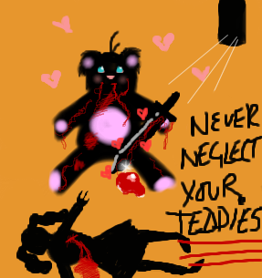 I've been neglecting my teddeh bear lately.D: I hope he doesn't get me.;-; And I like how the bear looks all innocent until you see that blood and knife.>_> It's like the Sour Patch kids commercial.xD