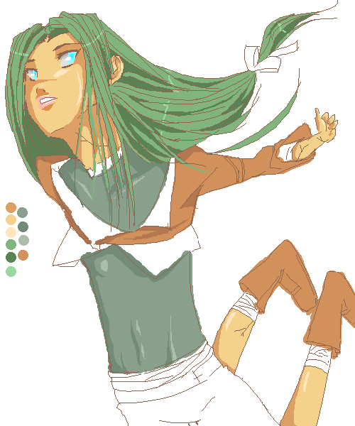 As for her legs both fore legs need to be lowered. As it is now the thighs would only be half as long then they normally would be. If we saw her knee it would be near the blue of the Description strip window. We'd only see a bit of her left leg. We would see the whole of her right leg. It needs to be shortened, only half the calf showing, in the perspective her right boot would look shorter than her right because of the angle.