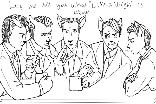 Okay, rollcall from left to right; Mr. White, Mr. Brown, Mr. Blonde, Mr. Pink and Mr. Orange. I made Mr. Orange a cat because, ya know, he turns out to be a cop at the end. And yeah, I know that this opening scene has more people, but I'm too lazy to add in Nice Guy, and all the others. The perspective and stuff is shit, but wtf ever :/