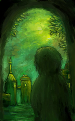 After reading the comments and looking harder at this piece I can see Van Gough and the skull, and looking harder it seems like all kinds of skulls in different angles from profiles to head on shots can be seen. Really really interesting piece. And it's not an insult but I thought he was maybe a sasquatch passing a peaceful little village, that won't be so peacful anymore.