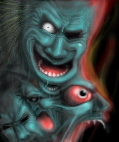 This kicks webpages of ass. First off the palette works so good. Im gonna have use it in the future. The top most face rules and grabs my attention. Its depth and mouth (ie the teeth!) look great. Plus the ghastly faces all medn together. Definitly one of my favorite works of yours.