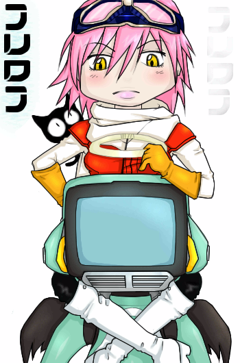 (^w^) It's chibi Haruko on Canti's shoulder's, trying to take off his fake halo, lol. She has Takkun on her shoulder =3 Furi kuri rocks <3P.S. This is my first time drawing any of them =D
