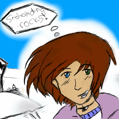 Just my first piccie on here! I'm getting used to my tablet, ehich I just got, so there are a few discoloration errors. I have to say, though I have dreams, I have NEVER been snowboarding, but I've played SSX to it's fullest extent. I lovvit. Please give me any hints or tips to help me improve. This is my chara, Hitaro, a 23-year-old who dropped out of Law School because it was just boring... >< He hangs out with my friend and My characters, Ratchet and Leekleek!! Ratchet is mine. Leekleek is my friend's. Well, that's all! ~Alumini^^
