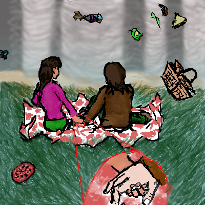 Dreaming again, or is it a nightmare?That feeling pervading, the animals flee So as the world dies around us And this madness looms onwards us Be with me. If only for the end of the world Be with me. --------------------------------- Still getting used to the applet, so went way over the space limit. I'll have to forgive myself for submitting before I got the grass around the picnic cloth and that edge to the right, or for having terrible clouds.