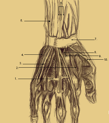 The muscles protude only at the sides. The back of the hand is lean and tendinous, with the muscles situated between the bones.1. The transverse ligament fastening the tendons together 2. Interosseus dorsalis muscle 3. Extensor digiti Vth proprius muscle 4. Abductor digiti Vth muscle 5. Extensor carpi ulnaris muscle 6. Extensor digitorum communis muscle 7. Dorsal retinacular transverse carpal ligament 8. Extensor carpi radialis longus muscle 9. Extensor carpi radialis brevis muscle 10. Extensor digiti Ist longus and brevis muscle