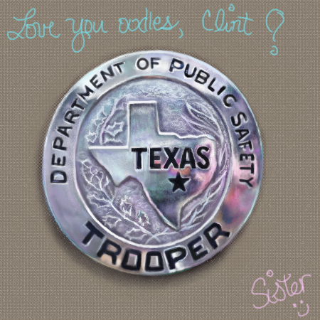 I tried to paint my baby brother's highway patrol car (some of you were unfortunate enough to get a glimpse of my attempt) I gave up on it, I just couldn't get the wheels right. This http://new.photos.yahoo.com/deadlyblondearcher/album/576460762310485368/photo/294928803036212293/0 was the car I was painting. He came over day before yesterday to have lunch with me, I took a picture of him with his current car... it's thishttp://new.photos.yahoo.com/deadlyblondearcher/album/576460762310485368/photo/294928804383901133/7 ugly Ford with ugly rims, :O ANYWAY.... so I'm painting his badge, instead.I know it seems relatively boring and rather "sterile" for a piece of art, but I really wanted to do it, so I AM. :)