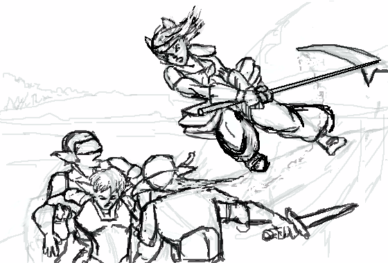 One idea Cameron. Very, very rough sketch. That's Trish coming to your rescue. :)I can try another, let me know. Setting to finished because I need the space. Cam can still color it later. At his leisure.