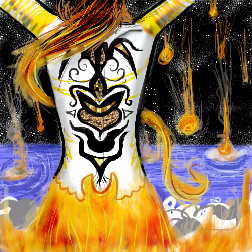 edit:I kinda pictured a flat drawing of flames as the background (flat so that they wouldn't blend too much with her) hmmm I dunno.