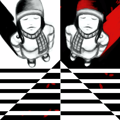 If you put a short white shadow right behind the one in black not only will he stand out, but his hat would be noticed more. Just a suggestion. (or a red shadow to go with the eye's)