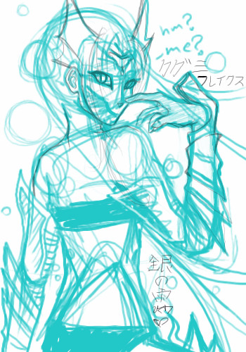 I'll have to finish this later, sorry. >___<;;Um, I used a photo reference of myself for the pose, 'cause I couldn't get the arm to look right, so yeah. rawr. Gotta go. DX