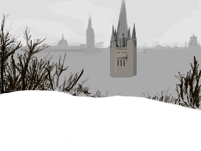 It's a delightful image that shows depth and distance with beautifully detailed buildings (especially the Cathedral) The people in the foreground add to the illusion of depth and the muted colors of the city against the contrast of the tobogganers gives this a whimsical charming feel. I expect one of those people to wipe out any minute. :)
