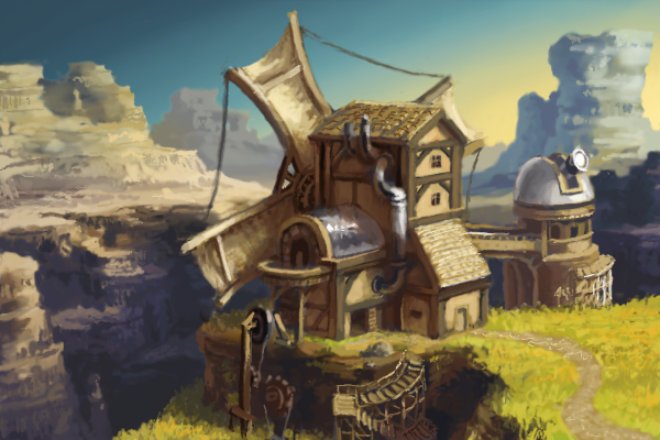 I guess I mean it looks more cartoony than I want. My intention was to make something that looked like it was painted from a real photograph, and even though what's there now is good that doesn't mean I'm accomplishing what I set out to do. It's a tendency of mine to make structures with cartoony or children's-book-esque proportions, and although there's nothing really wrong with that on a per-picture basis, it's frustrating to consistently end up in a style other than what you envision in your mind's eye. Thanks though. :)