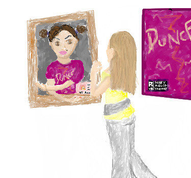 Explaining this a bit. I hoped you would be able to tell what was going on but my sister didn't get it so I will explain. Well my sister thought it was an art gallery, when I told her it wasn't, that it was a movie, she though the yellow shirt girl was complaining or something. Well, no, if you look closer you can see that the poster for the movie she (the girl's name is Ann) is going to watch is rated R (Restricted to over 18's). Ann looks quite a bit younger and you can see that the lady at the counter thing (let's call her Trish) is holding an ID card which says 'Ann, 47'. Ann is obviously not 47, she is using a fake ID. Trish is telling her to buzz off.
