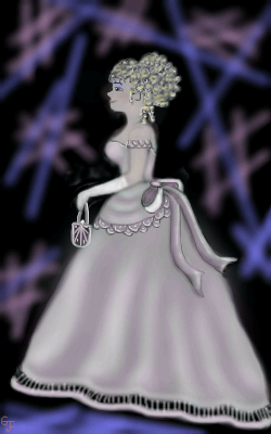 this is adorable glo! she is so pretty, reminds me of cinderella a bit. I like the background, but if you don't mind a suggestion...what would really set it off would be to take the background colors in the lights and have them highlighting on the gown and the lady, just a hint here and there to equalize the foreground with the background. very well done!
