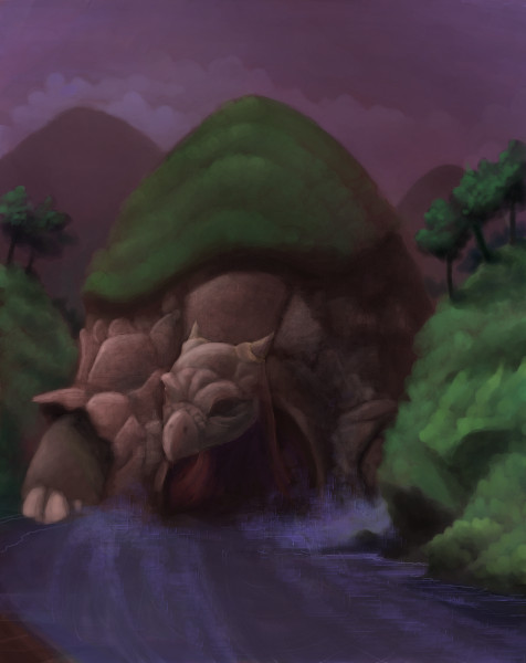 He has the look of an old powerful spirit god, and the textures and color you used gives it added dimension. I especially like the trees on the hills and splashes of water. This is a pleasure to look at and gives an added dimention to a simple subject like Turtles.