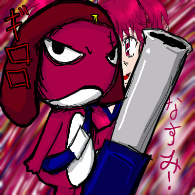 But yeah, anyways, it's my favourite character, Giroro, from the anime Keroro Gunso, and that's supposed to be Natsumi behind him.. And I just realized I used the wrong symbol for her name.. oh well, I'll fix it later, or just take her out entirely, I need to go to work soon.. but yeah, my backgrounds suck horribly.. really really bad.. but yeah, I tried. it was just supposed to be a quick doodle, anyways..