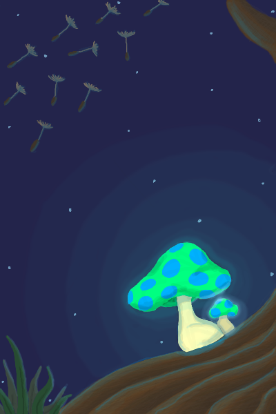 This is pretty, I like the ground and the sky gradation but that mushroom seems like an afterthought, not meaning to be mean it just makes this piece unfinished. If you added some shadows and maybe a few other 'shrooms this would look more finished. These are suggestions, not any harsh critique.