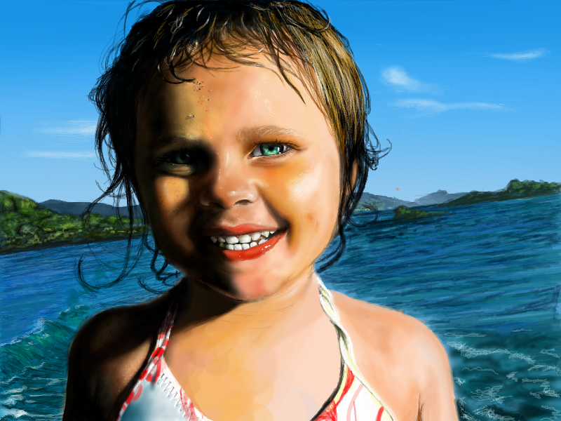 wow! she's so adorable!! and i don't wanna curse her or something...but she has the most GORGEOUS eyes!!! i think u did extremely well on the skin, and the background also looks amazing....great work on the hair too, (wish i could draw as well as u =[ )